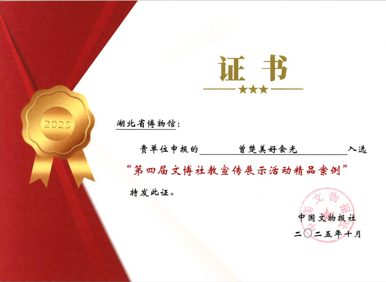 2025年10月29日,湖北省博物馆申报的《曾楚美好食光》《“中国核潜艇之父”——黄旭华院士》荣膺由中华文物交流协会指导、中国文物报社主办的“第四届文博社教案例宣传展示活动精品案例”及“优胜案例”两项大奖。