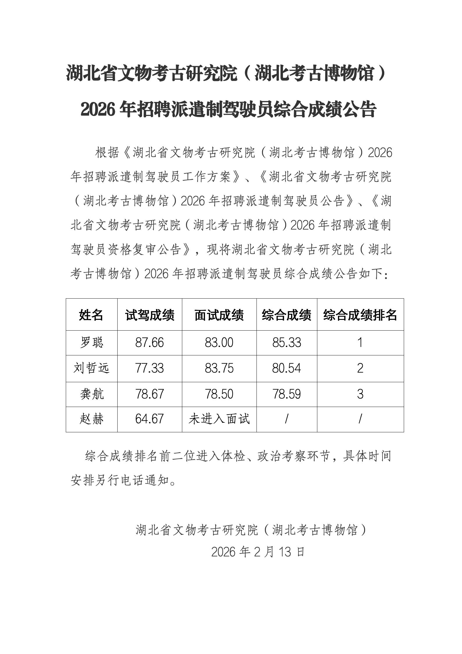 湖北省文物考古研究院(湖北考古博物馆) 2026年招聘派遣制驾驶员综合成绩公告